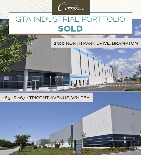 Carttera is pleased to announce the successful sale of +600,000 sqft. GTA industrial portfolio, comprising three newly constructed buildings. This best-in-class LEED designed industrial portfolio, included 2300 North Park Drive in Brampton and 1652 & 1672 Tricont Avenue in Whitby was one of the highest quality industrial offerings of significant scale to be offered in the GTA in recent history. Carttera’s offering was represented by the experienced and committed CBRE Capital Markets National Investment Management Team of peter senst, Matt Brown and Ian Kitt.